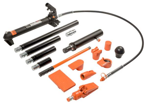 Hvert sett inneholder: Håndpumpe, slange, hydraulisk sylinder, spreder, gummihode, gummibelagt trykkplate, 90° V-plate, riflet løftesadel, utvendig gjengeadapter og et bredt utvalg av forlengelsesrør