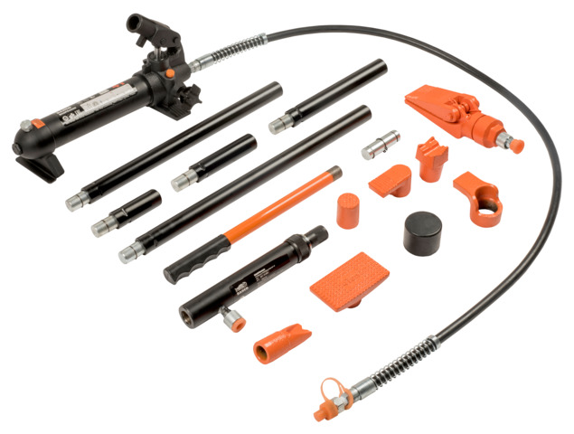Hvert sett inneholder: Håndpumpe, slange, hydraulisk sylinder, spreder, gummihode, gummibelagt trykkplate, 90° V-plate, riflet løftesadel, utvendig gjengeadapter og et bredt utvalg av forlengelsesrør