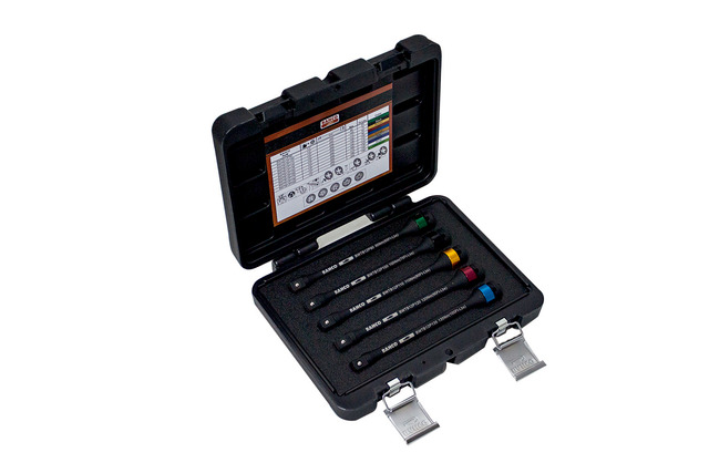 Leveres i en formstøpt koffert med skumplastinnlegg som holder verktøyene på plass