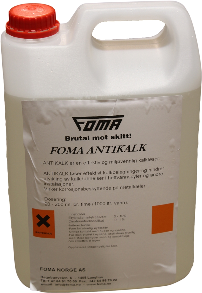 Avkalkningsvæske 5 liter Varenummer: FOMA 149014 Tidligere eller alternative varenumre: 149014 PRCH46794 FOMA Avkalkningsvæske er spesielt utviklet for fjerning av kalkbelegninger i varmtvannsvaskere og andre installasjoner. Virker korrosjonsbeskyttende på metalldeler. Dosering: 20 - 200 ml. pr. time (1000 ltr. vann.) 768,- (614,- eks.mva.) pr. kanne. Lagerbeholdning: 5 Antall produkter Kjøp Beregn frakt Ditt postnummer Sjekk fraktpris Regner ut...