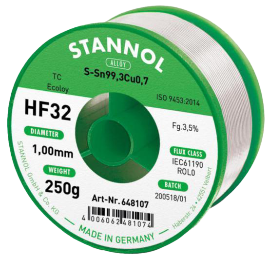 Stannol serie HF 32. Blyfri. For elektronikk og miniatyrloddinger. Med flussmiddel på hartsbase. Legering S-Sn99,3/Cu0,7. Fluss 3,5%. Grønn etikett. Flussmiddelet er Halid-fritt og av type ROL0 (IEC 61190-1-3) / 1.1.3.B (DIN EN 29454-1) / F-S. Flussrestene er ikke korrosive etter DIN 8516. Flussmiddel behøver ikke vaskes av.