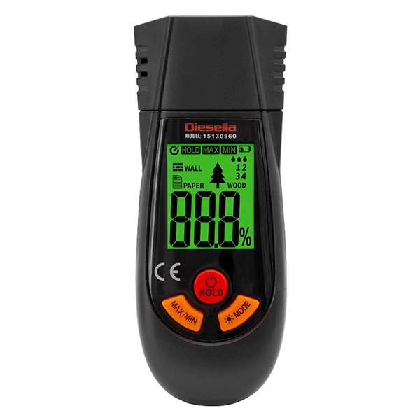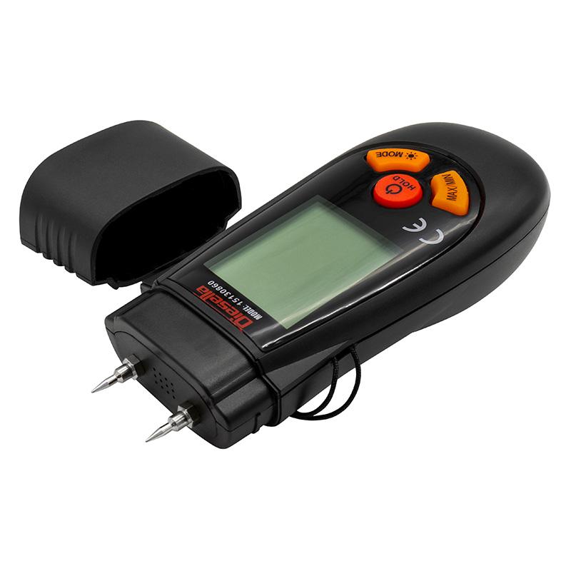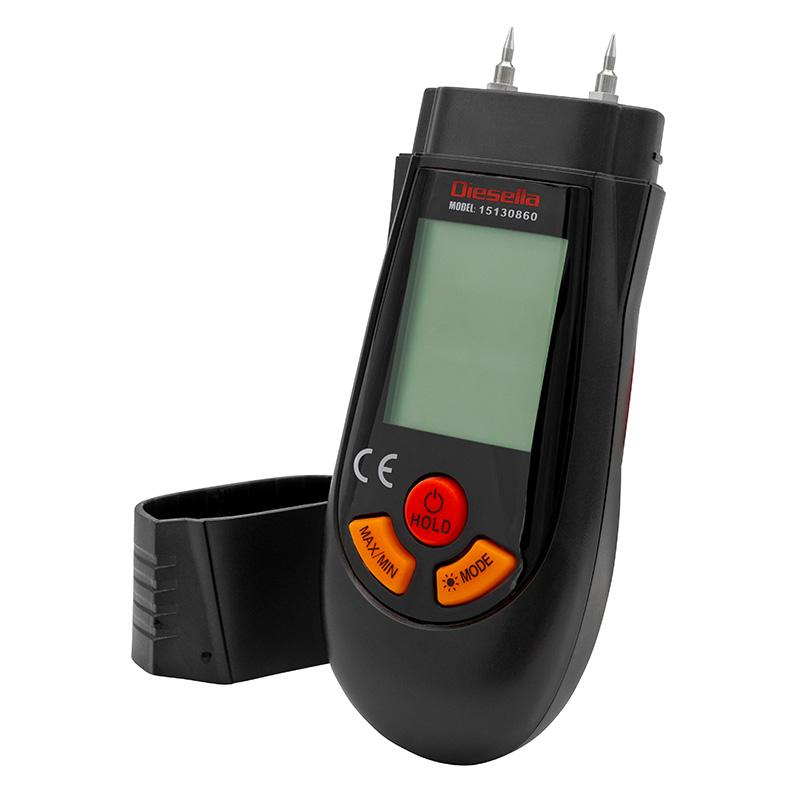 Brukervennlig «liten» håndholdt fuktighetsmåler for måling av fuktighetsinnhold i treverk/tre ved å trykke to målespisser inn i materialet.