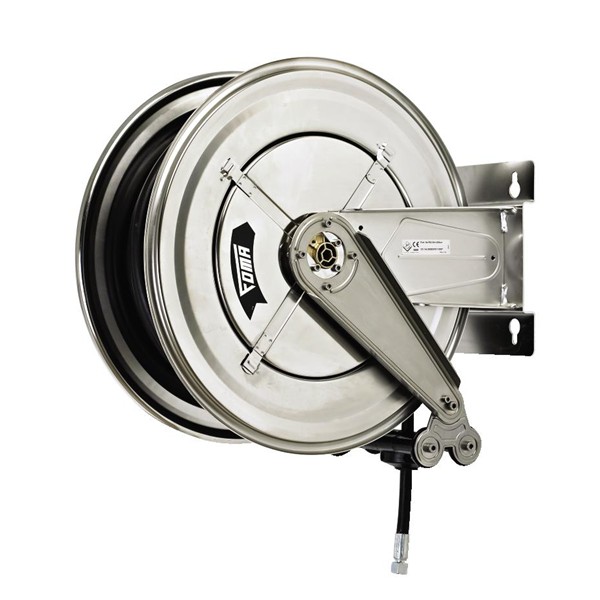 For høytrykk, maks. 150°C. Kan monteres på vegg eller i tak med automatisk retur av slangen. Trommelen leveres med svivel som har tetninger beregnet for temperaturer opptil maks. 150°C. Leveres standard uten/eventuelt med slange. Høytrykkslangene er levert med syrefast fittings.