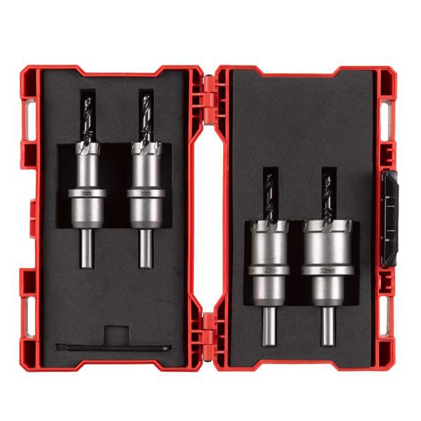 Karbid tannteknologi sørger for den beste ytelsen, hastighet og 10x lenger levetid enn standard bi-metall hullsager. Tennene kan slipes. Ekstra dyp 25 mm boredybde i platemateriale og rør. Hullsagdesignet reduserer vibrasjoner og sørger for nøyaktig boring. Kantstopp forhindrer at man borer for dypt. Innvendig fjær skyter pluggen ut, som sparer tid. Diameter 16-76mm og >80mm med 13 mm 3-sidet feste. Utskiftbar pilotbor og fjær. Bruk et kjølende smøremiddel for å forlenge levetiden. Til bruk i metall bruk kjøleolje, i auminium terpentin, i plastikk vann, og i støpejern bor uten smøremiddel. Egnet til boring i stål (<1200N/mm²) opp til 4mm, rustfritt stål opp til 2mm, aluminium, sink, støpejern, kobber, glassfiber og PVC. 4 x T.C.T hullsag ⌀ 16, 20, 25, 32 mm. 1/8˝ umbrakonøkkel.