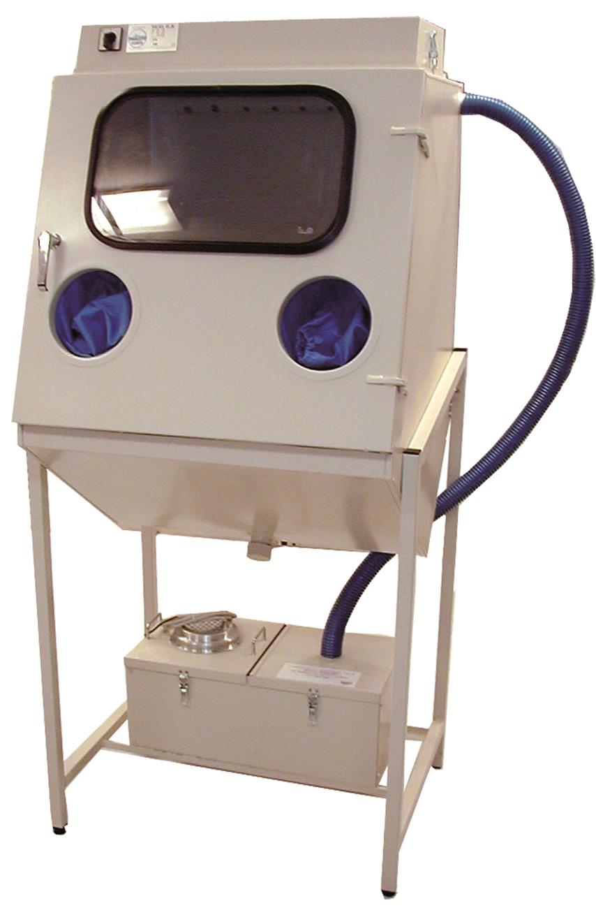 Modellen ILB 775 har stor frontlucka för lätt inlastning av gods som skall blästras. Modellen har stor siktruta av 4mm härdglas monterad i z-list för enkelt byte. Blästerpistolen är på 400/L Kabinen har stoftutsug monterat som standard bestående av ett Förfilter och ett Microfilter. Blästerkabinen kan enkelt placeras i vilken lokal som helst då man slipper externt utsug.