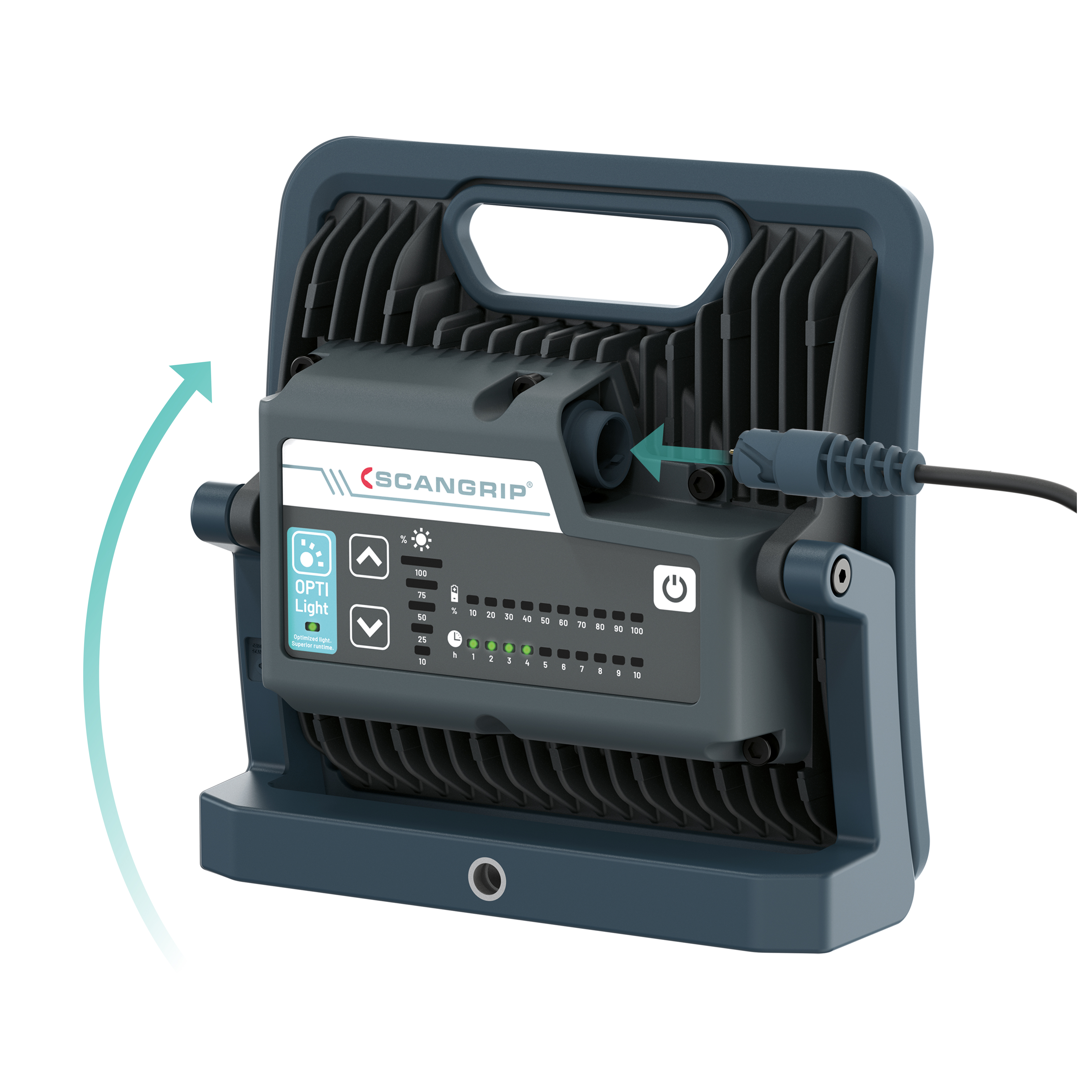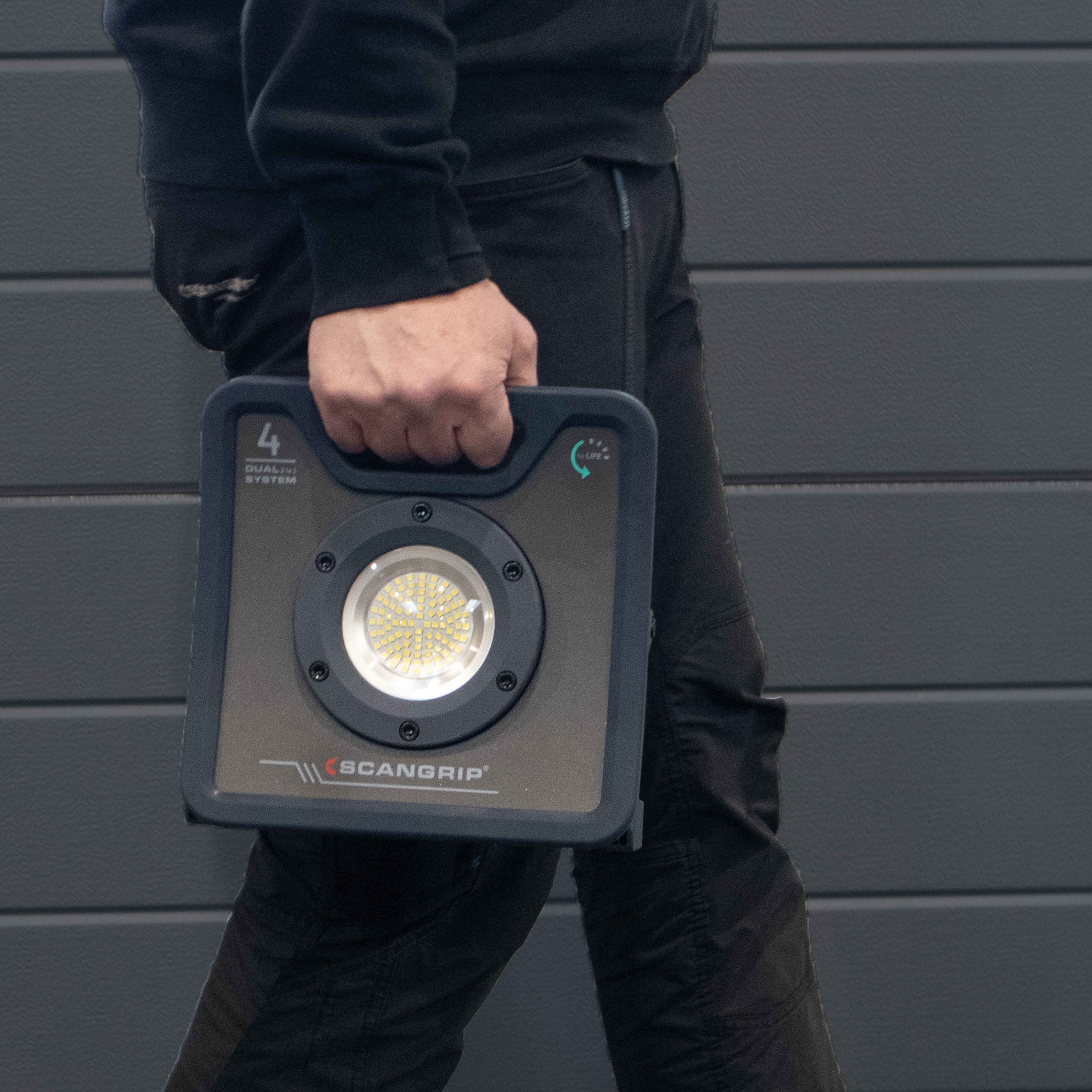 DUAL SYSTEM gjør at arbeidslampen kan brukes med en 5 m gummikabel eller uten kabel, noe som gir større fleksibilitet på arbeidsplassen. Det tar bare et sekund å koble til strømkabelen – eller koble den fra når du trenger en trådløs arbeidslampe.
