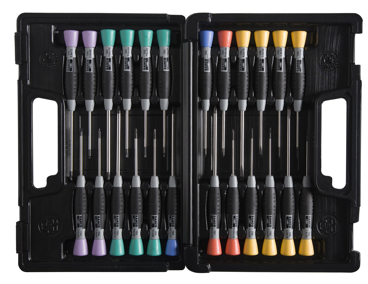 Bahco elektronikkskrutrekkersett 24-deler Varenummer: 706 5 Spesifikasjoner Tekniske data Sett med 24 stk. presisjonsskrutrekkere For spor, Phillips®, Pozidriv®, Torx®, sekskant Leveres i en plasteske med hull for oppheng Enhet Verdi 700 (Spor) 1.0*50 1.2*50 1.5*50 1.8*50 2.0*50 3.0*50 3.5*75 4*75 701 (Phillips®) PH00*50 PH0*50 PH1*75 702 (Pozidriv®) PZ0*50 PZ1*75 703 (Torx®) T6*50 T7*50 T8*50 T9*50 T10*50 T15*75 T20*75 704 (sekskant) H1.5*50 H2*50 H2.5*50 H3*75