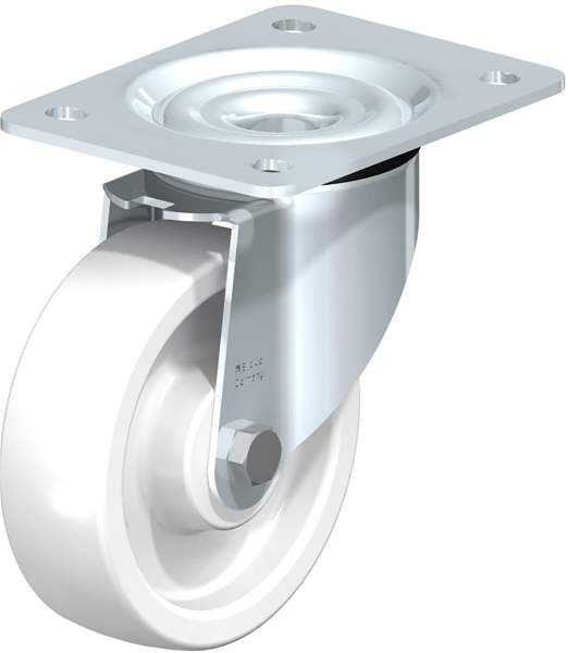 Av kraftig, presset stålplate, med dobbelt kulelager i svingkransen, stabil senterbolt og svingkranstetning. Den spesielle Blickle-monteringmetoden av svingkransen, samt kaldherding av kulenes løpebane gir en presis og lett rotasjon og lang levetid. Skrudd hjulaksel. Galvanisk forsinket, blå passivert, Cr6-fri.