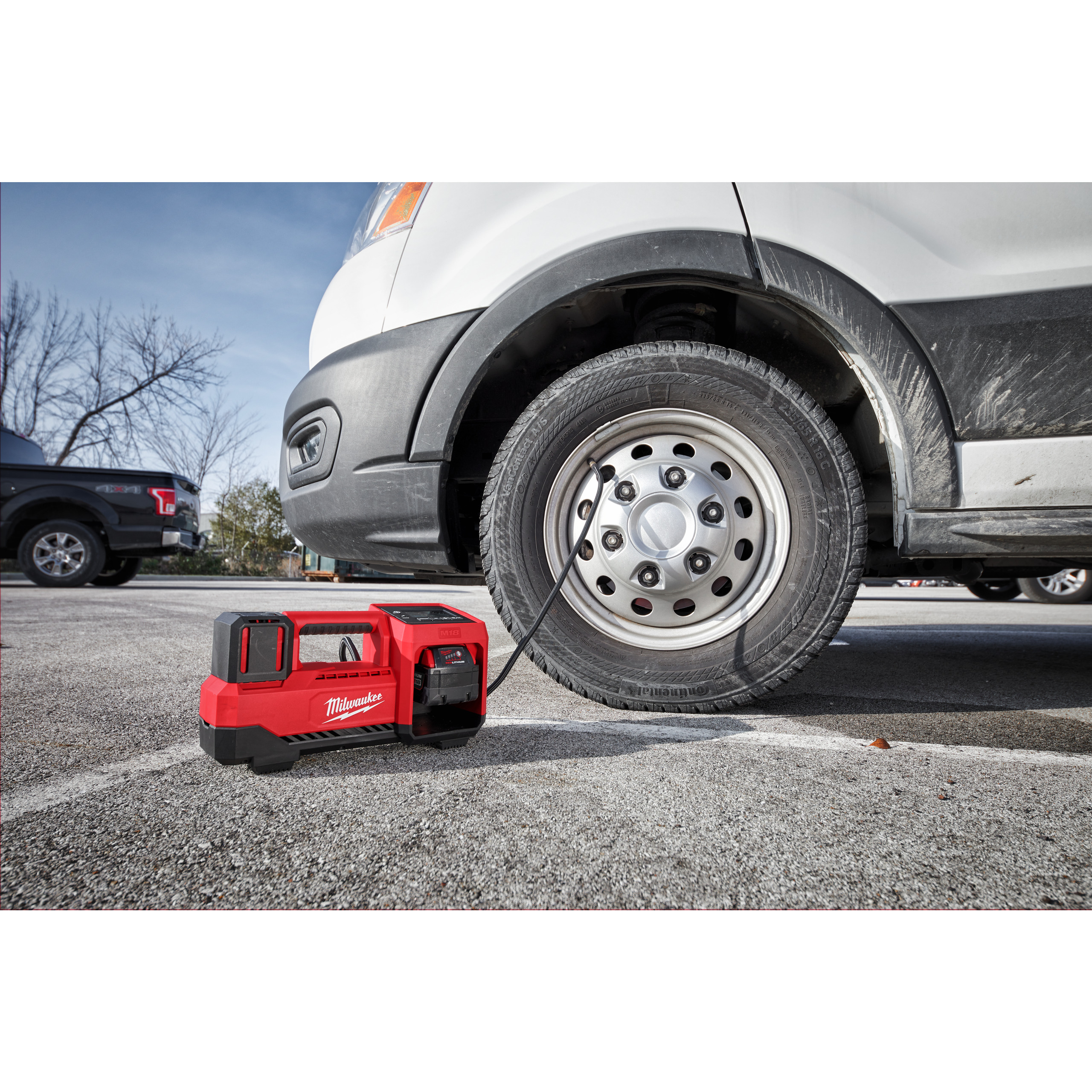 M18™ kompakt kompressor for biler og lette lastebiler. Automatisk avstengningsfunksjon ved ønsket trykk. Fyller opp til 30 dekk på et M18™ 5.0 Ah-batteri. Lufttrykk opp til 10,3 bar. Fire forinstillinger og tre måleenheter. Opplyst LCD-display med digital trykkindikator og batterimåler. Vekt med 12.0 Ah-batteri 4,8 kg. Leveres med ballnål, prestaventiladapter, mundstykke og Schrader messingchuck (uten batterier og lader).