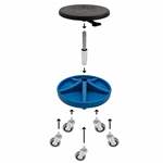 Robust krakk for industrielle formål med komfortabelt sete i PU-skum og trinnløs justering av setehøyde. Fast blå fotstøtte med 5 rom for oppbevaring av bolter, muttere, skruer, verktøy etc.